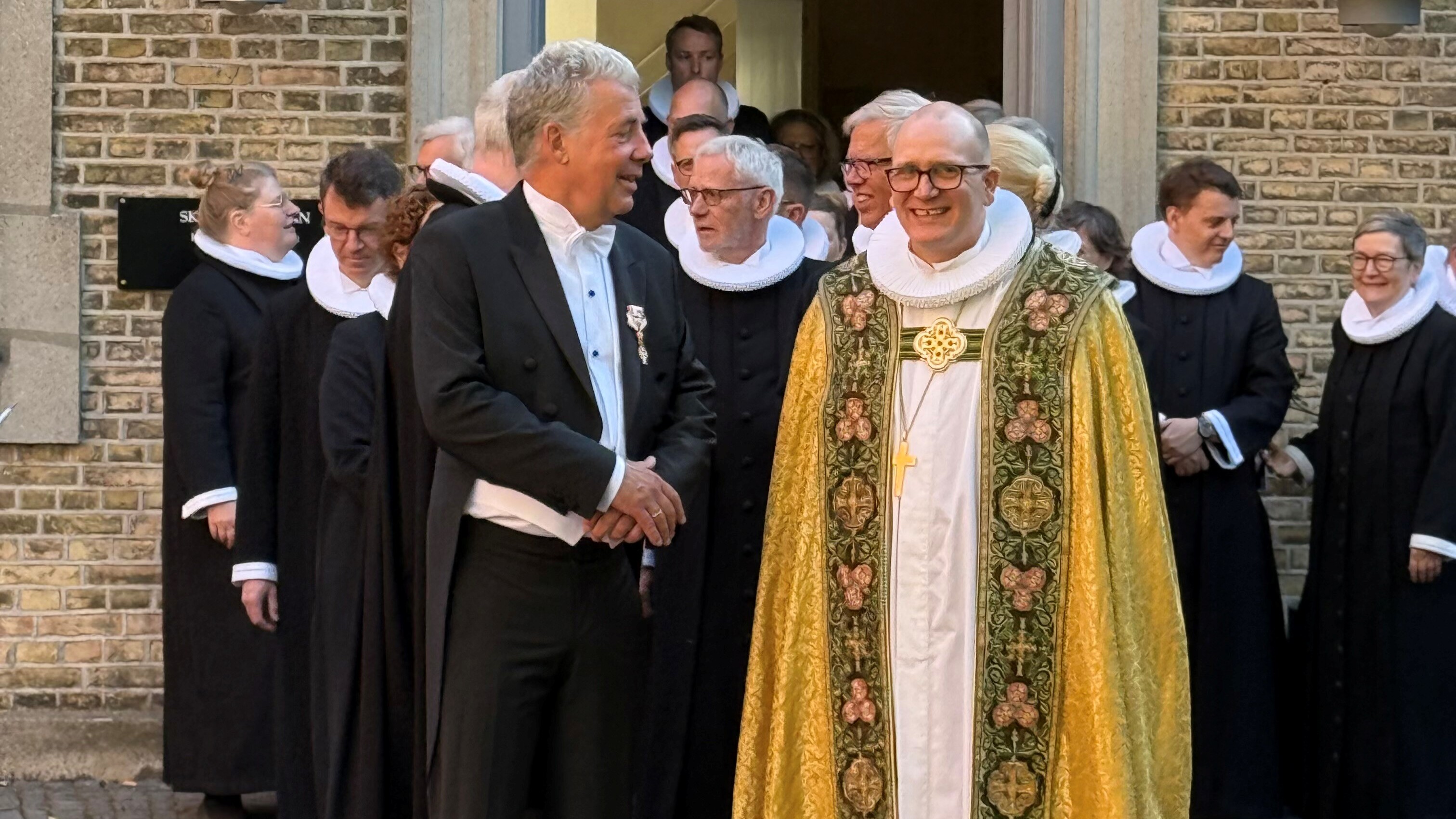 Biskop Mads Davidsen gør sig klar til at lede den traditionsrige procession sammen med Stiftamtmand Henrik Horster.