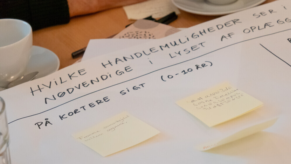Et stort antal gule post it-sedler og A3-papirer fylder bordene. Debatten går lystigt, og det kan næsten se ud som om, at kuglepennene flyver rundt over bordene i jagten på at nedskrive de mange ideer.