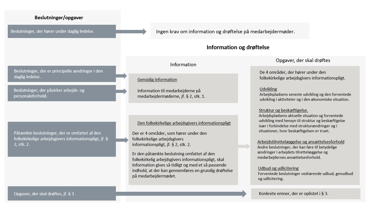 Aftalens § 2, stk. 2, og § 3, er særligt centrale, fordi der er krav om information og drøftelse. Den folkekirkelige arbejdsgiver skal være opmærksom på, at mange beslutninger vil være omfattet af § 2, stk. 2, eller være opgaver omfattet af § 3 og derfor skal drøftes på et medarbejdermøde.