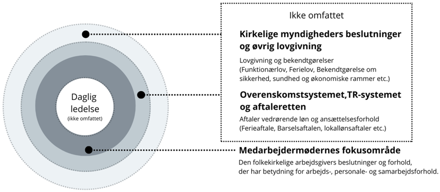 Medarbejdermødernes fokusområde Daglige ledelsesbeslutninger er ikke omfattet af aftalens § 2. Forhold, der er reguleret af kollektive overenskomster og aftaler, herunder løn- og ansættelsesvilkår falder uden for aftalen. Principielle beslutninger i den daglige ledelse er imidlertid omfattet af aftalens § 2, stk. 1. Tegningen herunder illustrerer, medarbejdermødernes fokusområde.